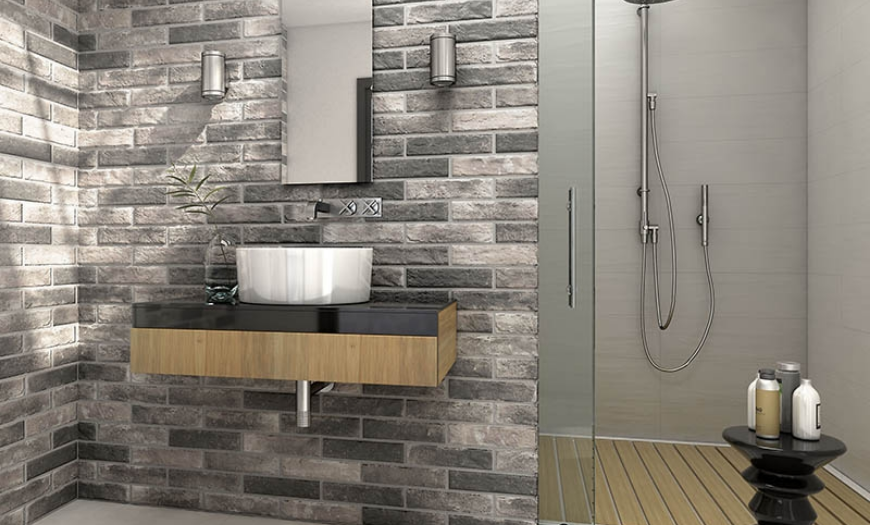 Плитка, имитирующая камень, мрамор, сланец и так далее, по-прежнему в моде и отлично подходит для оформления ванной комнаты в современном стиле