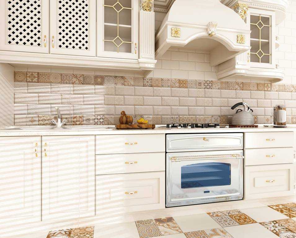 Настенная и напольная плитка в стиле пэчворк с узорным поясом на фартуке кухни разнообразят интерьер помещения