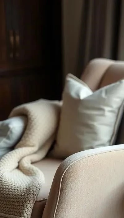 После освещения наступает черед текстиля, мгновенно добавляющего тепла, мягкости и уюта. Выбор материалов и фактур критичен для тактильного комфорта. Плюшевые подушки для поддержки и мягкий плед – ваши лучшие спутники. Отдавайте предпочтение натуральным, дышащим материалам: шерсть, кашемир, хлопок, лен или бамбук (приятны к телу, гипоаллергенны). Экспериментируйте с текстурами: бархат, вельвет, крупная вязка или искусственный мех добавят глубины. Цветовая палитра должна гармонировать с интерьером, но могут быть и акценты. Спокойные пастельные тона, глубокие синие, зеленые или землистые оттенки создают расслабляющую атмосферу. Ковер или шкура под ногами добавит тепла, звукоизоляции, обозначит границы уголка.